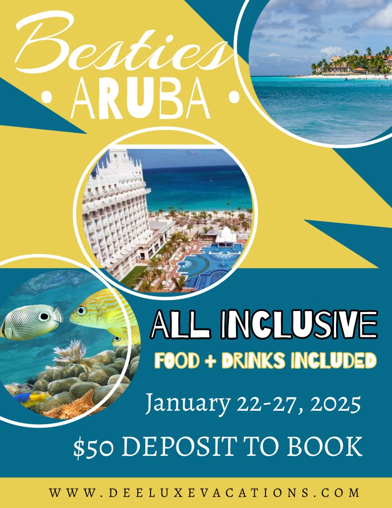 Join the #BestiesSquad on this all-inclusive island adventure to Aruba! We will be staying at an all-inclusive result (“The Palace”) so get ready to indulge in luxury and 24-hour service.