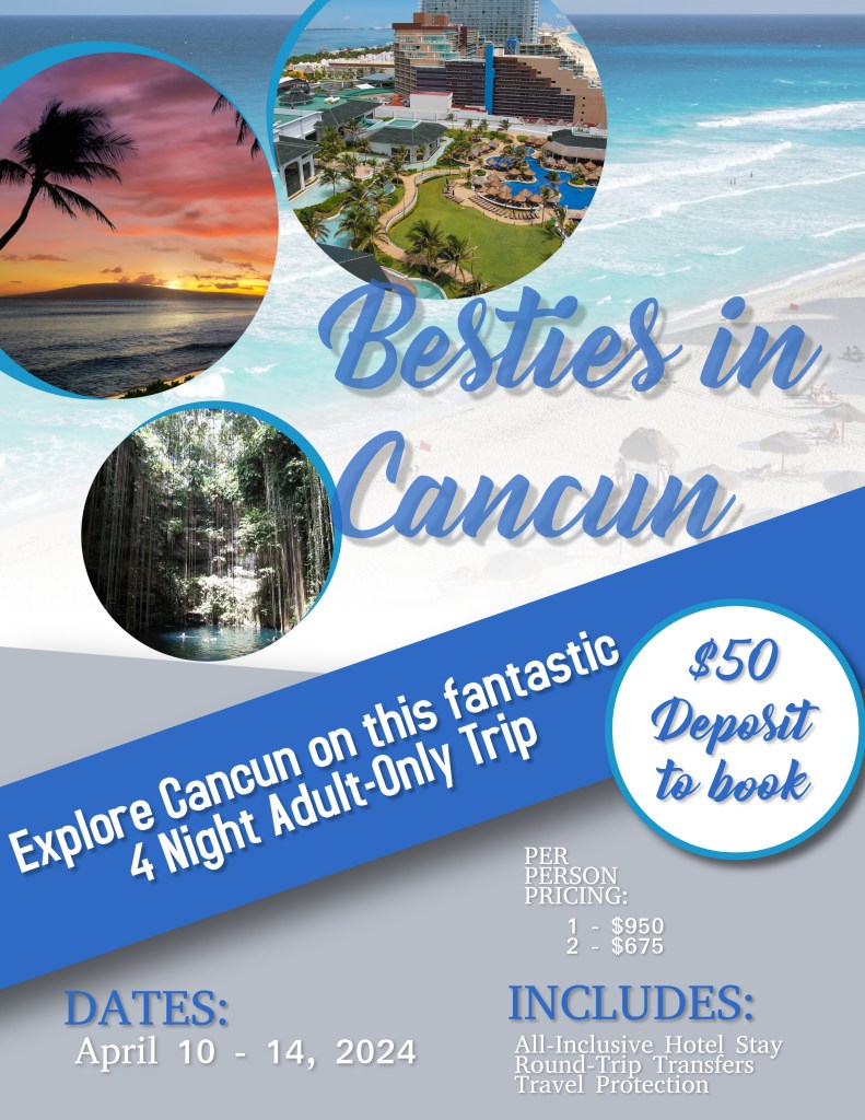 Besties in Cancun 2024 Registration Now Open! Join us on an ALL INCLUSIVE trip to Cancun, Mexico!