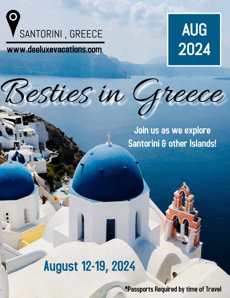 Join us as we explore Greece again! This will be our second group trip to beautiful Santorini. Please read the details below for all inclusions. You must have a passport by the time of travel (you still have time to obtain one if you do not have one currently)
