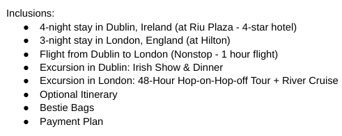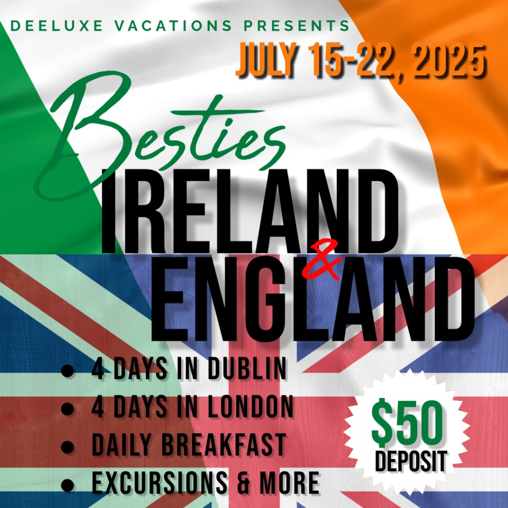 Join us as we explore two European Countries next Summer! This trip is perfect for Graduates, all ages are Welcome. Our first stop is Dublin, Ireland where we will explore the towns fun atmosphere and Irish roots. Our hotel is in the towns center so you won’t have far to go. Next on the list is London, England where its royal culture will leave you enchanted. Besties, Couples, Families, Solo Travelers, all are Welcome!