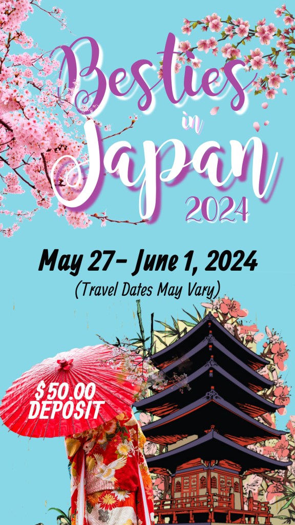 Besties! We’re headed to Tokyo, Japan in 2024! Join us on this once in a lifetime adventure as we explore Tokyo and other cities in Japan with our Besties. Don’t have a Bestie? Solo Travelers and Couples are also Welcome!