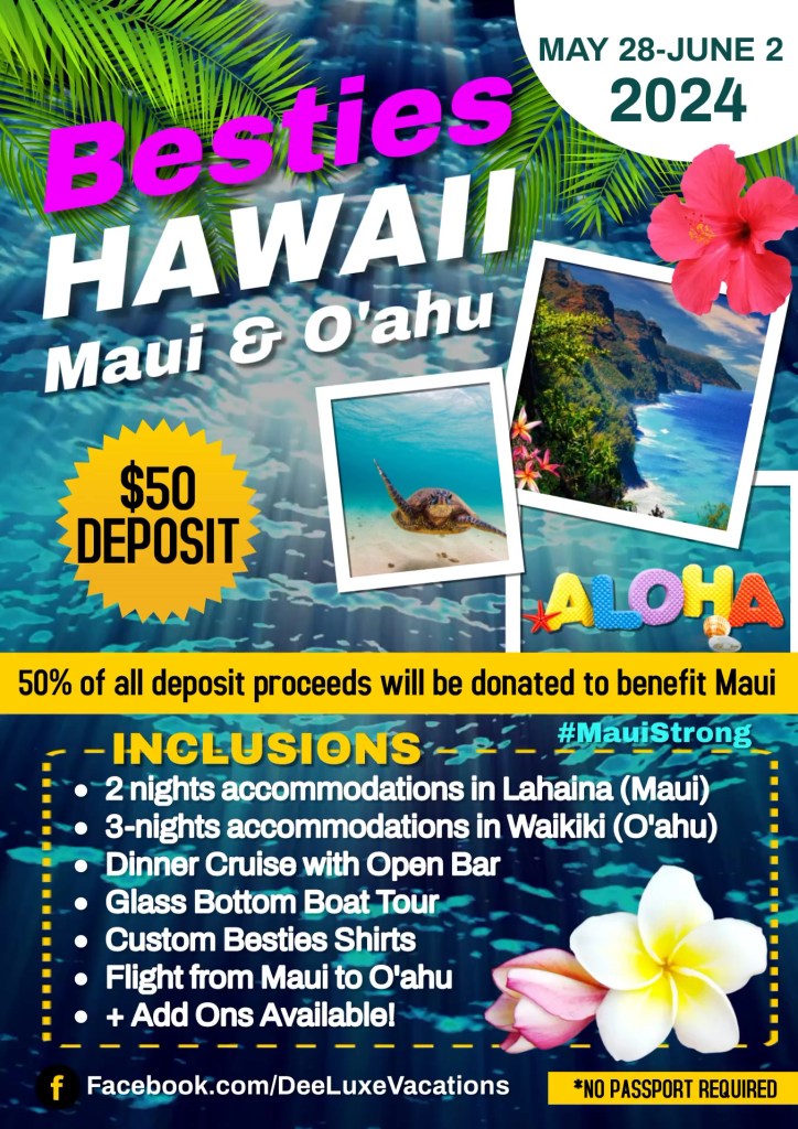 Join us as we explore 2 islands of Hawaii, Maui & O’ahu on our first-ever fundraiser trip. Let’s help make Maui Strong again! Due to the recent devastating wildfires in Maui, many locals have been displaced and their homes destroyed forever. To help the Maui community, DeeLuxe Vacations is donating 50% of all deposit proceeds from this trip to the Maui Strong Fund. This trip is open to everyone, from Besties, couples, singles, to families. There is no passport required making travel easier for everyone. Please read the details below.