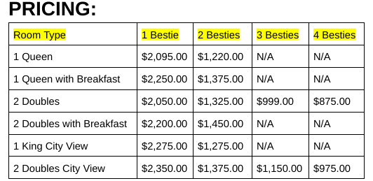 – NYE Bestie Bash $TBD (it will depend on how many total Besties we have, estimate is $250 per person with drinks)