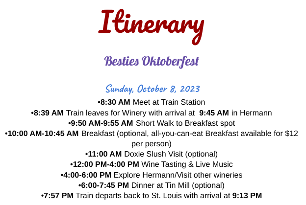Join us with your Besties at the wineries in Hermann this October! Your ticket includes roundtrip transportation by train, Oktoberfest with Live Music + Wine Tasting at Hermannhoff Winery. Breakfast, Lunch and Dinner will be available for purchase (not included).