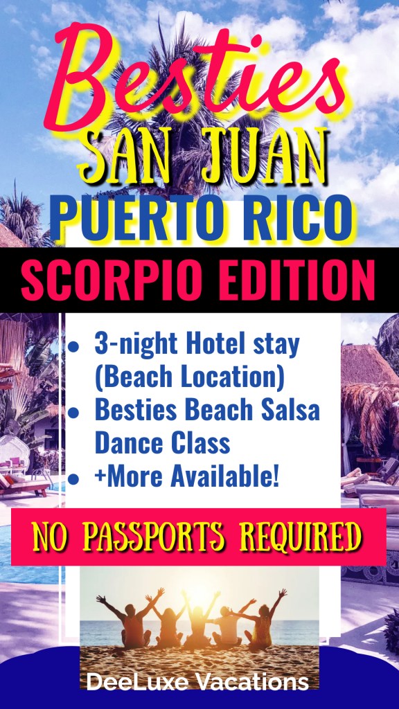 Join us in Puerto Rico for the Ultimate Getaway & Scorpio Birthday Bash! You don’t have to be a Scorpio to attend, everyone is Welcome! Although we will be staying on the beach, more excursions are available! No passport is required for Travel. Get ready to party with the #BestiesSquad!