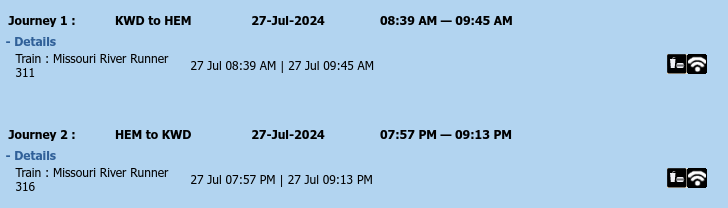 – Train Tickets transportation from Kirkwood to Hermann and back