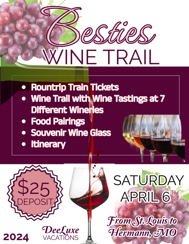 Join us for our Spring Winery Trail in Hermann, Missouri! The town of Hermann and its wineries will be hosting the Farmers Table Wine Trail this coming April with delicious wine tastings and food pairings. The menu is posted below for your review. Come have a fun day with your besties or meet new ones on this trip (Solo Travelers Welcome!)