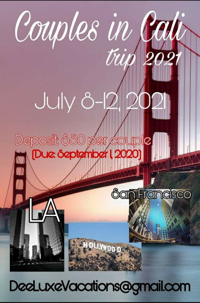 Couples in Cali 2021 2021-07-08T11:11:00 days hours minutes secondsuntilCali here we come!! Go backYour message has been sent Name(required) Warning Email(required) Warning Phone Number Warning Full Names & Birthdates of both Travelers Warning Departure Airport: Warning Payment Type: PayPal (DeeLuxeVacations@gmail.com) Venmo (@DeeLuxeVacations) Warning How did you hear about us? Search Engine Social Media/Facebook Friend or Family Warning Other Details Warning Warning. SendSubmitting form Δ Share this: Click to share on Facebook (Opens in new window) Facebook Like Loading...