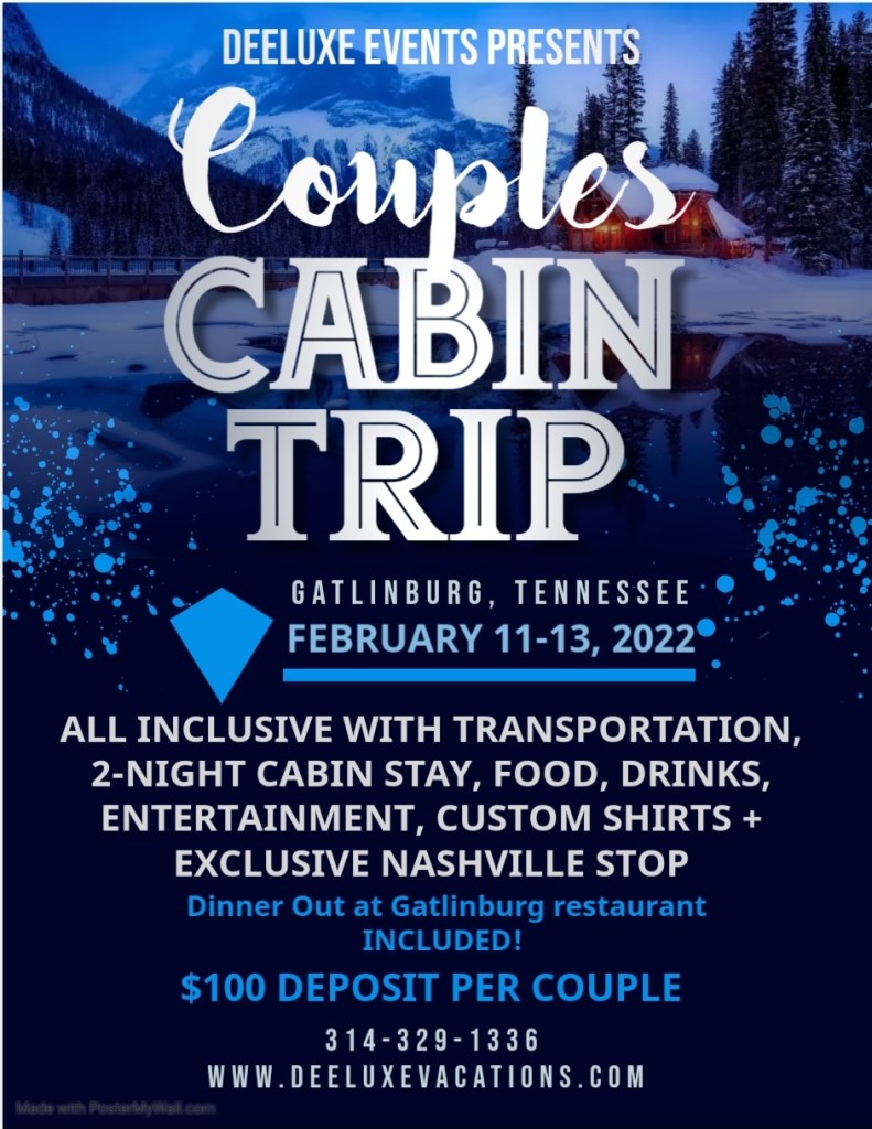 $100 Deposit towards Couples Cabin Trip February 2022 Pay Below
