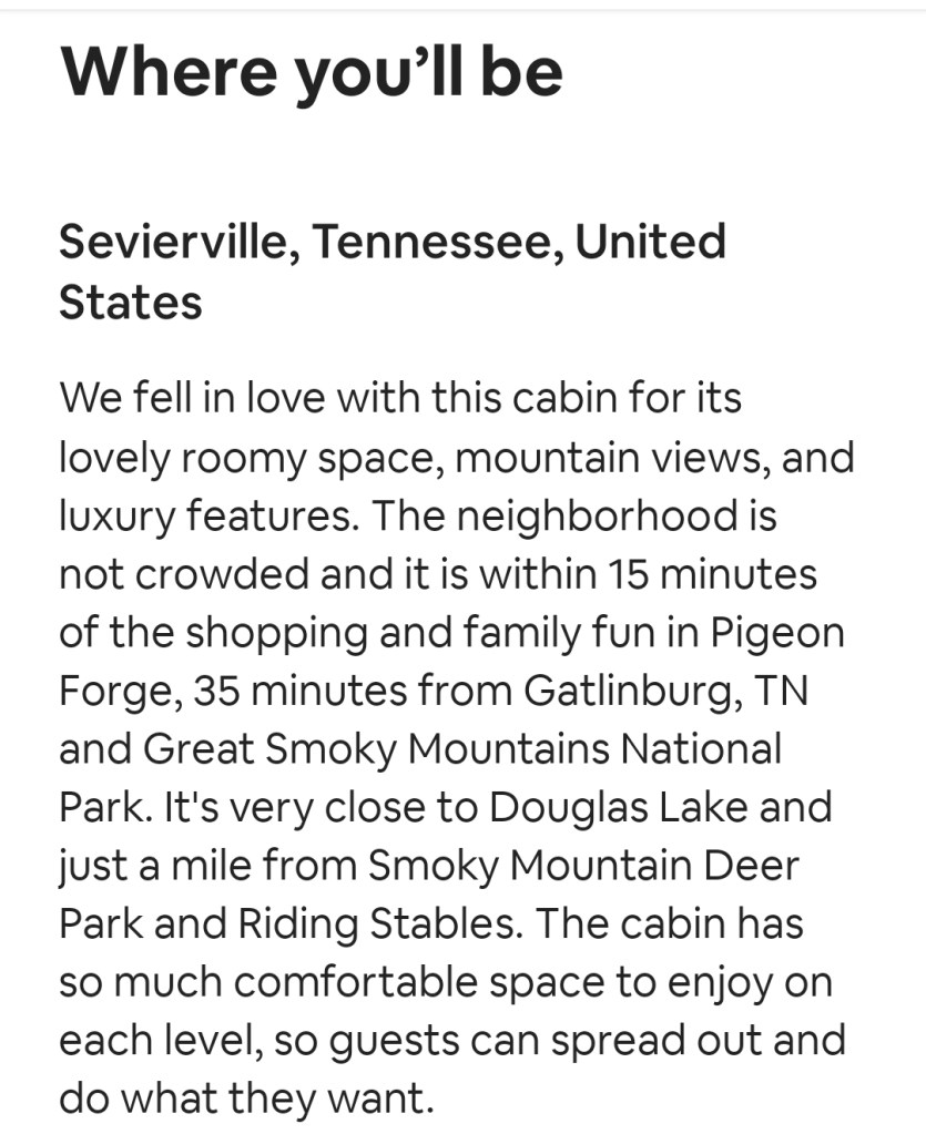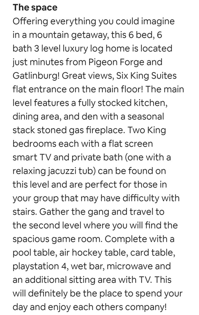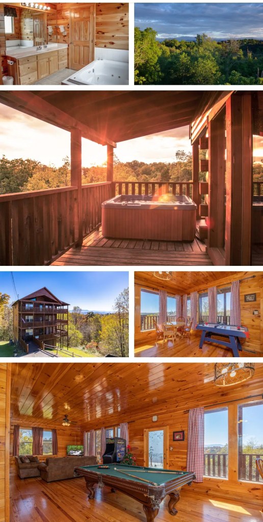 • 2-night stay in mountain cabin with 6 bedrooms 6 baths in Tennesse (you will get 1 King suite per couple with private bath). Multiple living spaces, hot tub and game room. Bedrooms will be assigned at arrival.