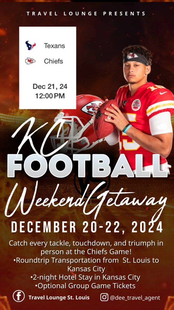 Join us for our epic Football Weekend in Kansas City! Come watch the Chiefs take on the Texans on Saturday, December 21st at Arrowhead Stadium.