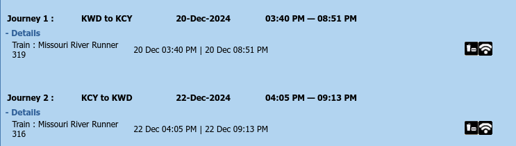 – Round-trip Train Tickets from St. Louis (Kirkwood station) to Kansas City