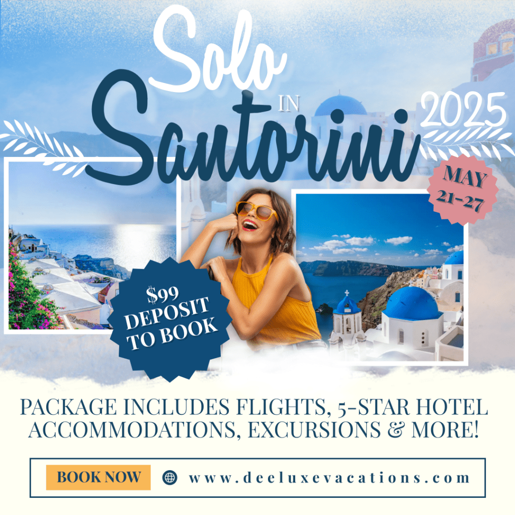 Calling all my Solo Travelers!!! Let’s head to Santorini for an unforgettable experience in Greek culture with amazing views, delicious food and lifelong memories.