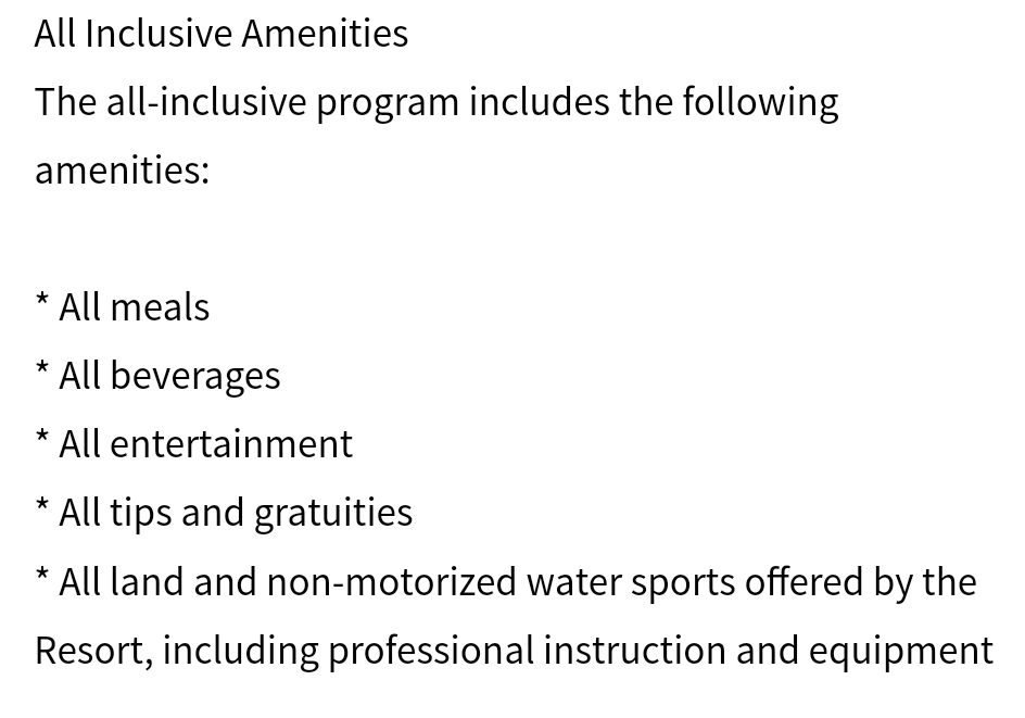 •All Inclusive with all Food, Drinks (alcoholic and non), snacks and entertainment.
