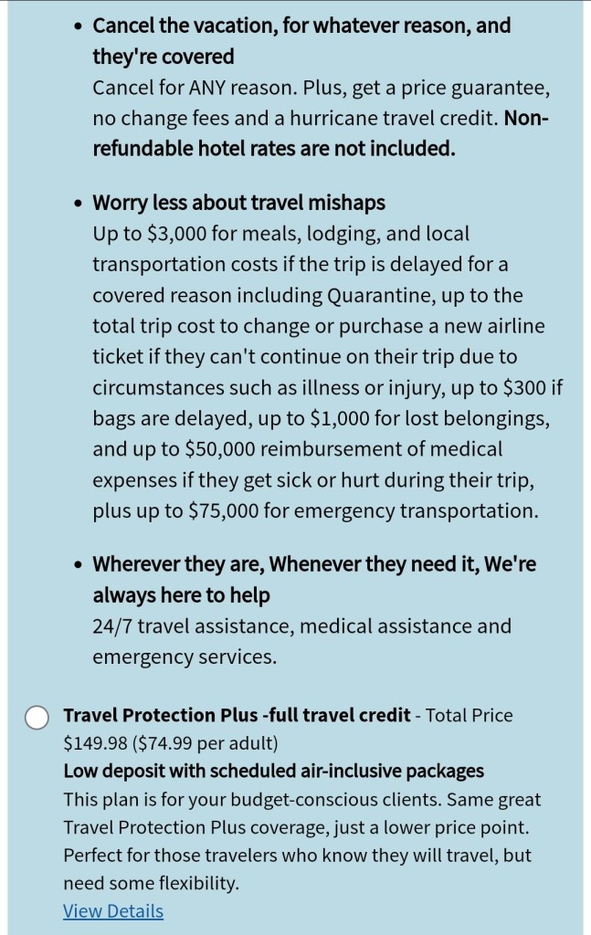 Travel protection: $74.99 per person