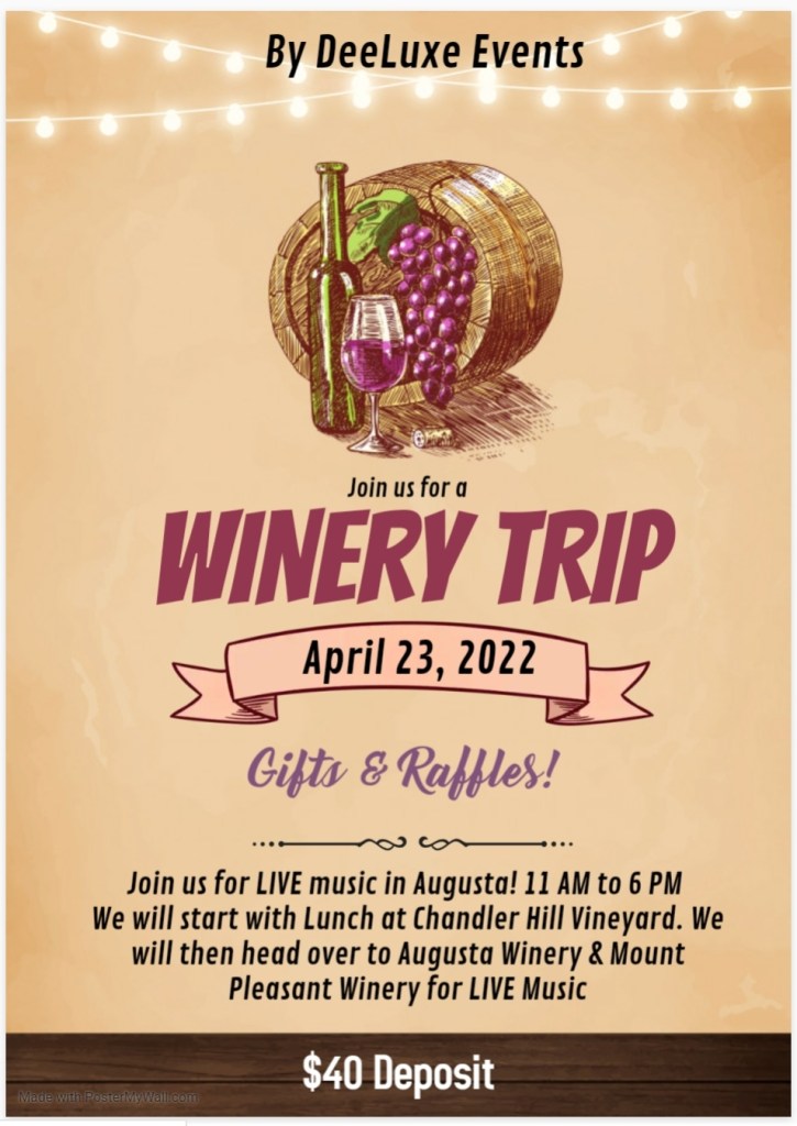 Join us as we explore 3 different wineries! Saturday, April 23, 2022. We will pick everyone up at River City Casino at 11 AM. We will head to Chandler Hill Vineyards, where we will enjoy lunch. Lunch is included! Next we will head to Augusta Winery, which is located right next door to our 3rd Winery, Mount Pleasant Winery. They will have LIVE music at both wineries. We will provide drinks (water & wine) and snacks on the bus. Everyone is welcome! Couples, Besties, Solos. Must be 21+